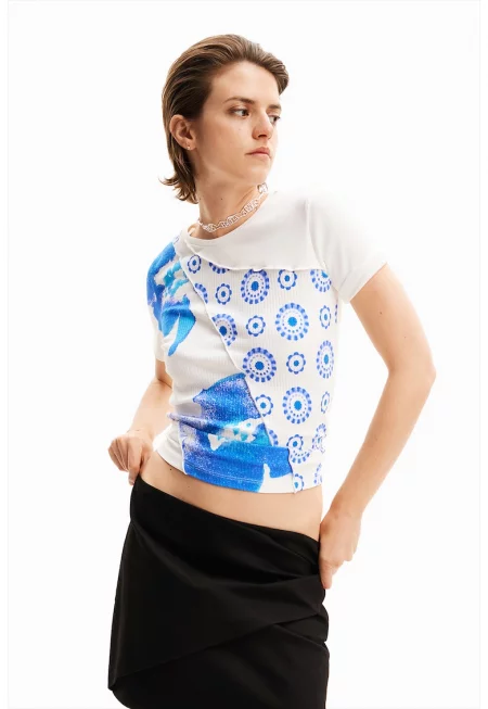 Къса тениска с апликация - Бял/Син