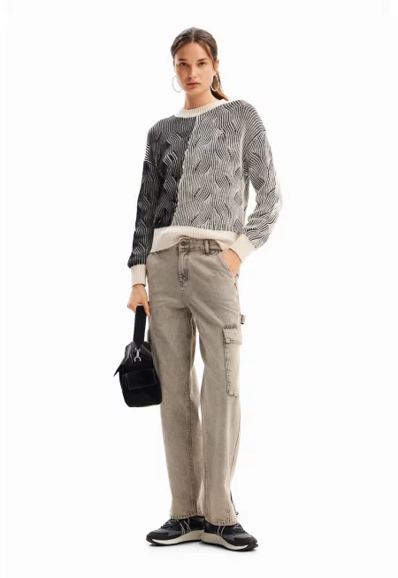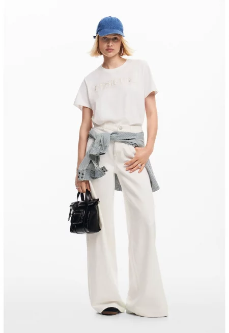 Панталон с широк крачол и висока талия - Мръснобял