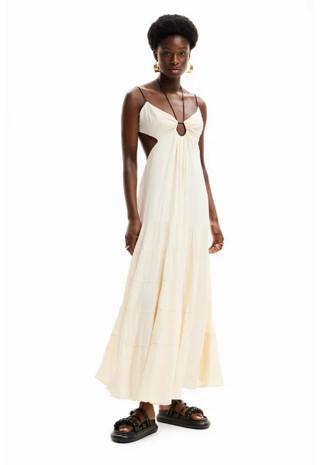 Разкроена рокля с изрязан гръб - Крем