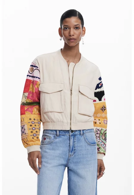 Яке с лен и контрастни ръкави - Черен/Бежов/Мандарина