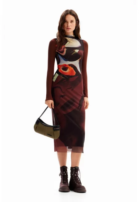 Рокля с мрежесто покритие - Кафяв
