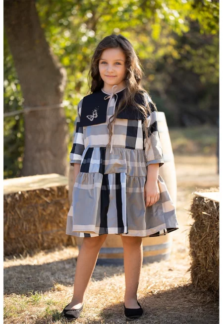 Разкроена рокля на каре - Черен/Светло сив/Бежов