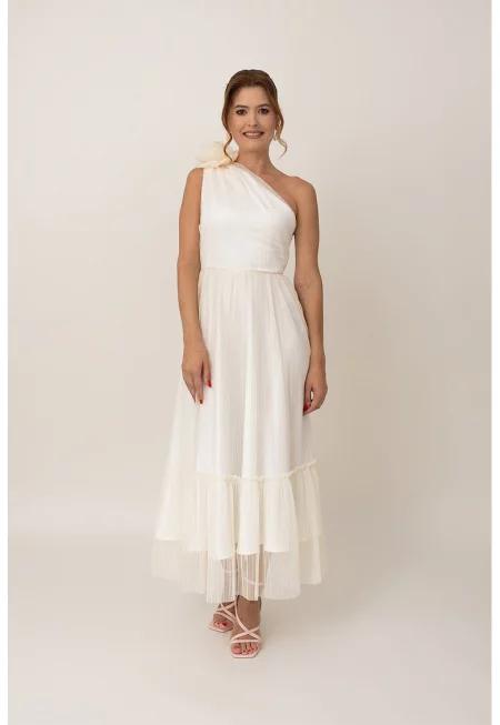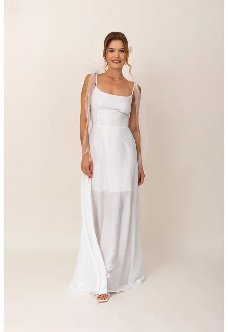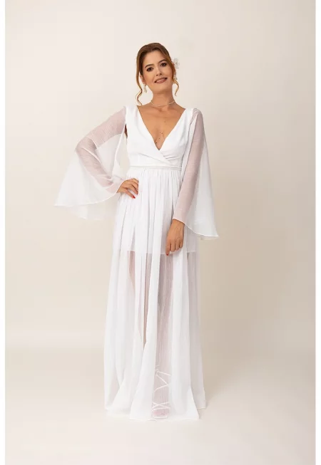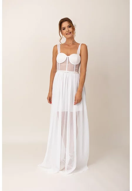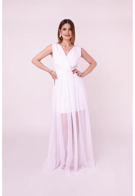 Дълга разкроена рокля с ефирни детайли - Бял/Прозрачен