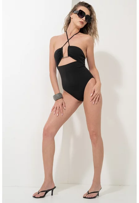 Основни детайли Тип продукт: бански 2 части Цвят: черен Принт: без принт Форма чашка: триъгълна Материал: синтетичен Презрамки: кръстосани на гърба Закопчаване: връв Дизайн Банели: без банел Стил деколте: високо - голи рамене Тип долнище: класическо Състав на материала ...