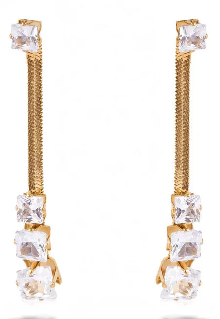 Характеристики Тип продукт: обеци Материал: инокс Цвят: златист Закопчаване: винтова пръчка Опаковка: продуктът се доставя в персонализирана опаковка. Състав Състав: неръждаема стомана Камъни: кристали Покритие: 0 -5 micron gold Размери Допълнителна информация: избягвайте ...