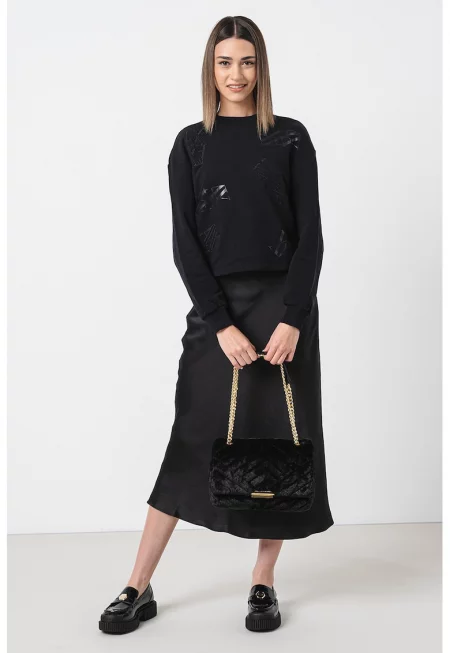 Характеристики Тип продукт: блузон Цвят: черен Принт: текст Материал: памук Кройка: стандартна Деколте: обло Закопчаване: без закопчаване Ръкави: маншети Дължина ръкав: дълъг ръкав Състав Външна част: 100% памук