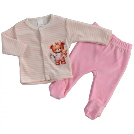 Симпатична и нежна памучна бебешка блуза с дълъг ръкав в розово, цвят праскова, цвят мента, зелено, жълто на райета, със сладко и закачливо мече, раздвижена и модерна ( малките размери имат копче на рамото за по-лесно обличане). Моделчето е изработено от качествена и ...