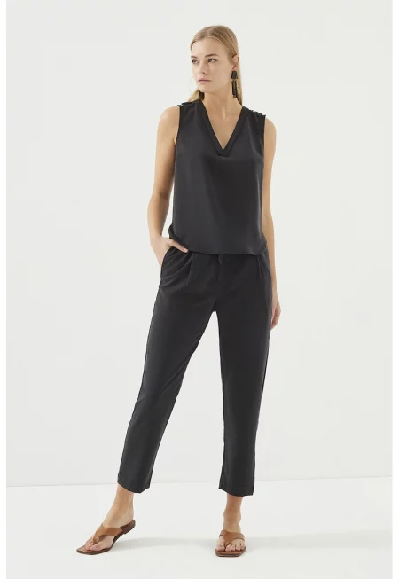 Характеристики Цвят: черен Стил: елегантен Материал: полиестер Принт: без принт Кройка: широк крачол Дължина: дълъг Талия: средновисока Джобове: 2 странични - 2 обшити Закопчаване: цип Състав Външна част: 100% полиестер Информация за модел Моделът е облечен с размер S/36 EU. ...