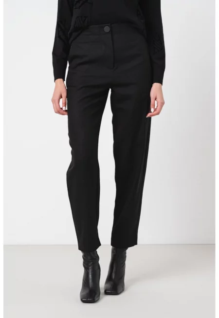Характеристики Цвят: черен Стил: елегантен Материал: синтетичен - вискоза Принт: без принт Кройка: широк крачол Дължина: дълъг Талия: висока Джобове: 2 странични Закопчаване: цип Състав Външна част: 67% полиестер - 29% вискоза - 4% еластан