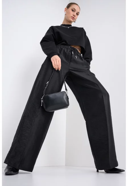 Характеристики Цвят: черен - тъмнобежово Стил: ежедневен Материал: вискоза Принт: животински принт Кройка: широк крачол Дължина: дълъг Талия: висока Джобове: 2 странични Закопчаване: без закопчаване Състав Външна част: 51% вискоза - 49% рециклиран полиестер