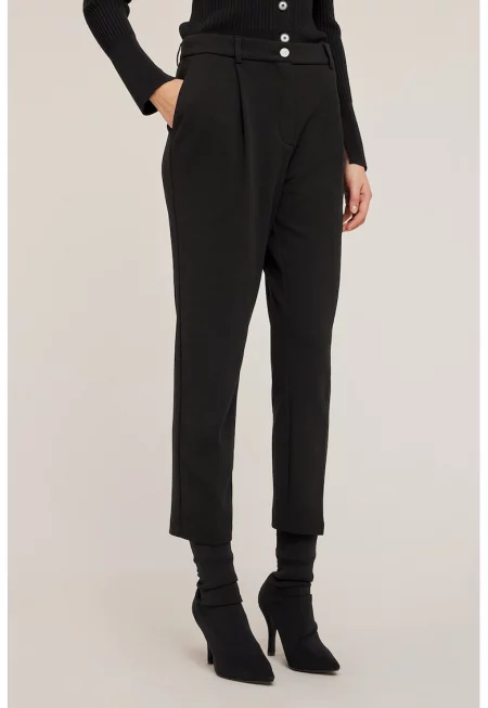 Характеристики Цвят: черен Стил: елегантен Материал: полиестер Принт: без принт Кройка: стандартна Дължина: дълъг Талия: висока Детайли: набирания Джобове: 2 скосени - 2 обшити Закопчаване: цип - копчета Състав Външна част: 100% полиестер