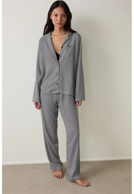 Характеристики Тип продукт: пижама Съдържание пакет: блуза и панталон Цвят: ментово зелено Принт: геометричен Материал: памук Деколте: henley Дължина ръкав: дълъг ръкав Талия: еластична Дължина панталон: дълъг Закопчаване: без закопчаване Състав Външна част: 100% памук