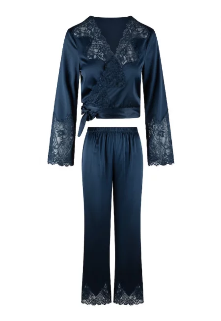 Характеристики Тип продукт: пижама Цвят: светлосин Материал: вискоза - изкуствена коприна Принт: без принт Яка: ревери Кройка: стандартна Дължина ръкав: къс ръкав Дължина панталон: дълъг Състав Външна част: 97% вискоза - 3% коприна
