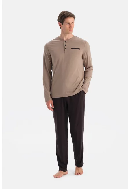 Характеристики Тип продукт: пижама Цвят: сив - тъмносин Принт: лого Материал: памук - модал Деколте: овално Дължина ръкав: дълъг ръкав Талия: средновисока Дължина панталон: дълъг Състав Външна част: 60% памук - 40% модал