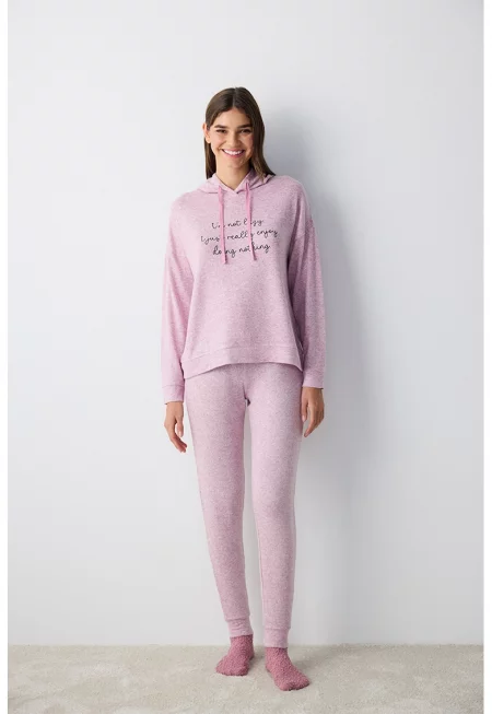 Характеристики Тип продукт: пижама Съдържание пакет: горна и долна част на пижама Цвят: тъмнокафяв Принт: текст Материал: памук Деколте: обло Дължина ръкав: дълъг ръкав Талия: еластична Дължина панталон: дълъг Джобове: 2 странични Детайли: връзка Закопчаване: без ...