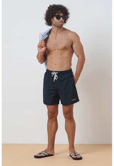 Характеристики Тип продукт: къси панталони Цвят: тъмносин Материал: полиамид Принт: лого Детайли: еластична талия - връзка Затваряне: без закопчаване Състав Външна част: 100% полиамид