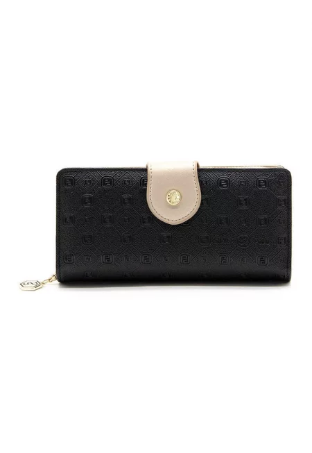 Характеристики Цвят: черен - мръснобял Материал: екологична кожа Принт: с принт - лого Джобове: един с цип отпред - отделения за карти - отделение за банкноти - мрежест джоб Закопчаване: цип - капси Състав Външна част: синтетика Размери Размери (см): 9 x 24 x 3 cm