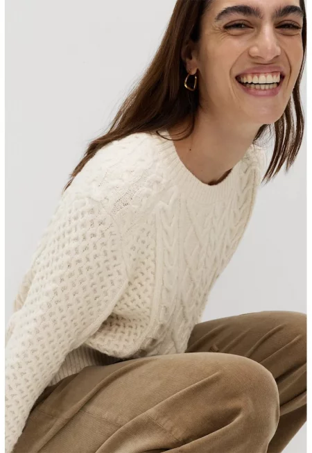 Характеристики Тип продукт: пуловер Цвят: мръснобял Принт: без принт Стил: ежедневен Материал: синтетичен - вискоза Модел: поло Кройка: свободна Закопчаване: без закопчаване Дължина ръкав: дълъг ръкав Състав Външна част: 52% вискоза - 29% полиестер - 19% полиамид
