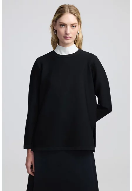 Характеристики Тип продукт: пуловер Цвят: черен - бял Принт: райе Стил: ежедневен Материал: полиестер - вискоза - полиамид Модел: обло Кройка: стандартна Закопчаване: без закопчаване Дължина ръкав: дълъг ръкав Тип ръкав: свободнопадащ Състав Външна част: 49% вискоза - 31% ...