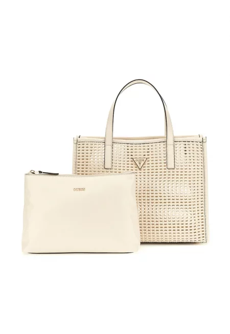 Характеристики Цвят: бял Материал: екологична кожа Модел: ръчна чанта Стил: ежедневен Принт: с принт - лого Дръжка: 2 фиксирани Презрамки: 1 регулируема и отделяща се Джобове: 1 вътрешен с цип Отделения: 3 отделения от които 1 с цип Цвят на метала: сребрист Закопчаване: ...