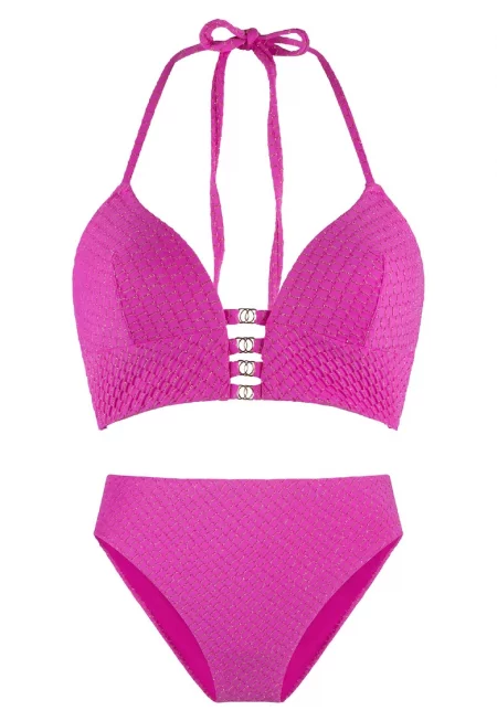 Основни детайли Тип продукт: сутиен Цвят: розов бонбон Принт: без принт Форма чашка: триъгълна Материал: синтетичен Детайли: декоративни камъни - лъскави елементи Закопчаване: връв Дизайн Банели: без банел Стил деколте: v Състав на материала Външна част: метал - еластан ...