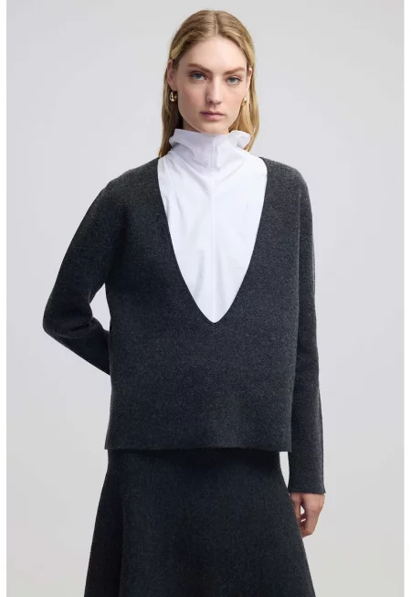 Характеристики Цвят: черен Принт: без принт Материал: вълна Кройка: стандартна Закопчаване: без закопчаване Модел: овален Дължина ръкав: дълъг ръкав Състав Външна част: 100% вълна Информация за модел Моделът е облечен с размер M. Размер на модела: 188 cm височина - 98 cm Гръдна ...
